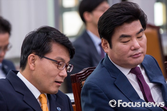 (서울=포커스뉴스) 원유철(오른쪽) 국회 외교통일위원회 새누리당 위원과 윤상현 국회 외교통일위원회 새누리당 위원이 22일 오전 서울 여의도 국회에서 열린 '외교통일위원회 전체회의'에 참석해 대화를 나누고 있다.