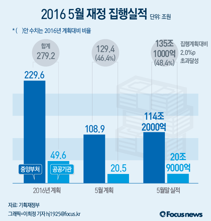 (서울=포커스뉴스) 22일 기획재정부는 ‘제6차 재정관리점검회의’를 열고 5월말 재정 집행실적을 점검했다. 5월말까지 중앙재정 집행 실적을 보면 정부는 당초계획보다 5조7000억원 초과한 135조1000억원(48.4%)을 집행했다.