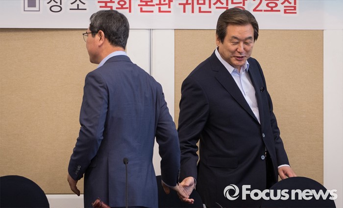 (서울=포커스뉴스)김무성(오른쪽) 새누리당 전 대표가 22일 오후 서울 여의도 국회에서 열린 비박계 새누리당 의원들이 주축이 된 '대한민국 미래혁신포럼' 창립 총회에서 김학용 의원의 손을 잡으며 인사하고 있다.