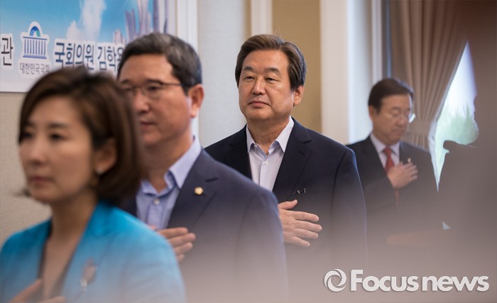 (서울=포커스뉴스)김무성(왼쪽 세번째) 새누리당 전 대표가 22일 오후 서울 여의도 국회에서 열린 비박계 새누리당 의원들이 주축이 된 '대한민국 미래혁신포럼' 창립 총회에서 국기에 대한 경례를 하고 있다.