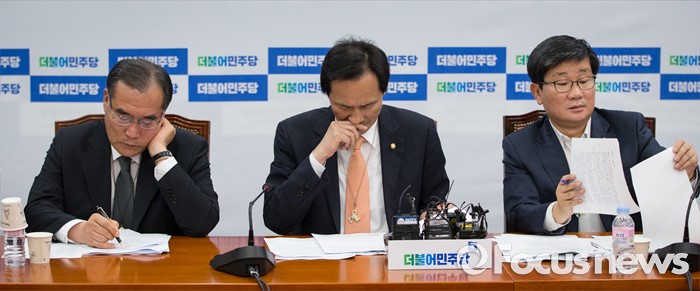 (서울=포커스뉴스) 우상호(가운데) 더불어민주당 원내대표와 이개호(왼쪽), 전해철 의원이 22일 오후 서울 여의도 국회에서 열린 더불어민주당 세월호 TF 회의에서 정리한 자료를 보고 있다.