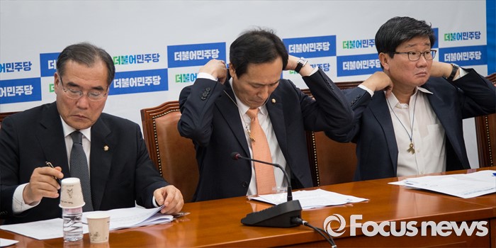 (서울=포커스뉴스) 우상호(가운데) 더불어민주당 원내대표와 전해철(오른쪽) 의원이 22일 서울 여의도 국회에서 열린 더불어민주당 세월호 TF 회의에서 세월호 참사 유가족이 만든 목걸이를 목에 걸고 있다.