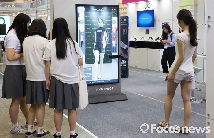 (고양=포커스뉴스) 22일 오후 경기 고양시 킨텍스 7홀에서 열린 2016 로보유니버스 & VR 서밋에 방문한 시민들이 가상 의류 피팅 부스를 관람하고 있다.