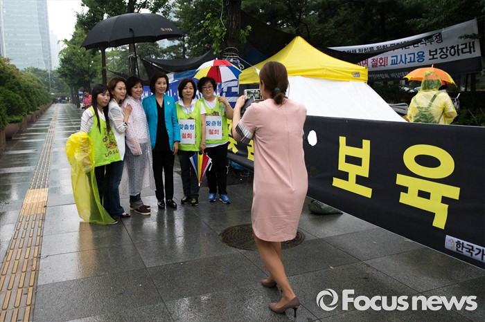 (서울=포커스뉴스) 22일 오후 서울 여의도 산업은행 본점 후문에서 한국가정어린이집연합회 비대위가 주최하는 '맞춤형 복지 시행 반대 단식 농성'이 열리고 있다.