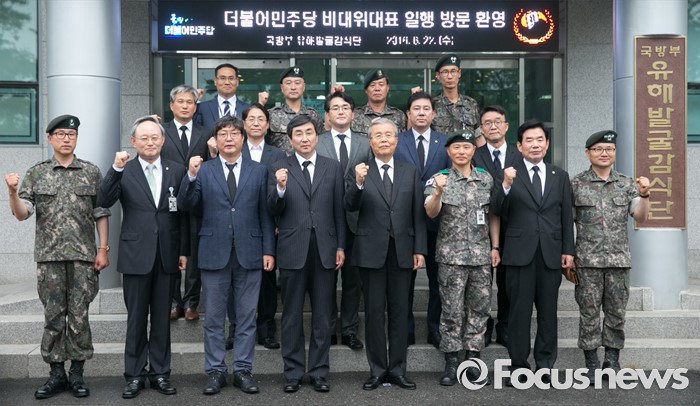 (서울=포커스뉴스) 김종인 더불어민주당 비대위 대표 등 의원들이 22일 오후 서울 동작구 국립서울현충원 내 국방부 유해발굴감식단을 방문해 이학기 단장 등 관계자들과 기념촬영을 하고 있다.