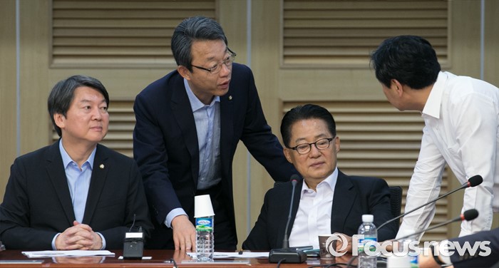 (서울=포커스뉴스) 23일 오전 서울 여의도 국회에서 열린 국민의당 19차 정책역량강화 워크숍에 참석한 안철수(왼쪽부터) 상임공동대표, 김성식 정책위의장, 박지원 원내대표, 김관영 원내수석부대표가 대화하고 있다.