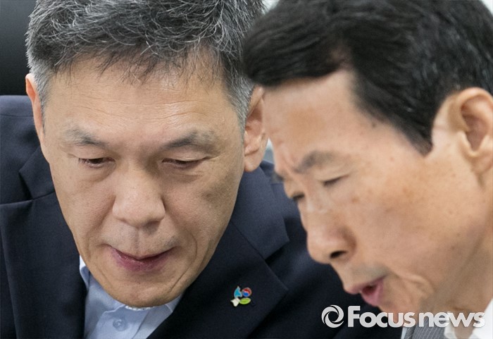 (서울=포커스뉴스) 23일 오전 서울 여의도 국회 의원회관에서 국가유공자 처우 개선 등 논의를 위해 열린 새누리당 민생혁신특별위원회-국가보훈처 간담회에 참석한 최완근(왼쪽) 국가보훈처 차장과 유주봉 보상정책국장이 대화하고 있다.
