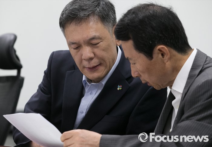 (서울=포커스뉴스) 23일 오전 서울 여의도 국회 의원회관에서 국가유공자 처우 개선 등 논의를 위해 열린 새누리당 민생혁신특별위원회-국가보훈처 간담회에 참석한 최완근(왼쪽) 국가보훈처 차장과 유주봉 보상정책국장이 대화하고 있다.