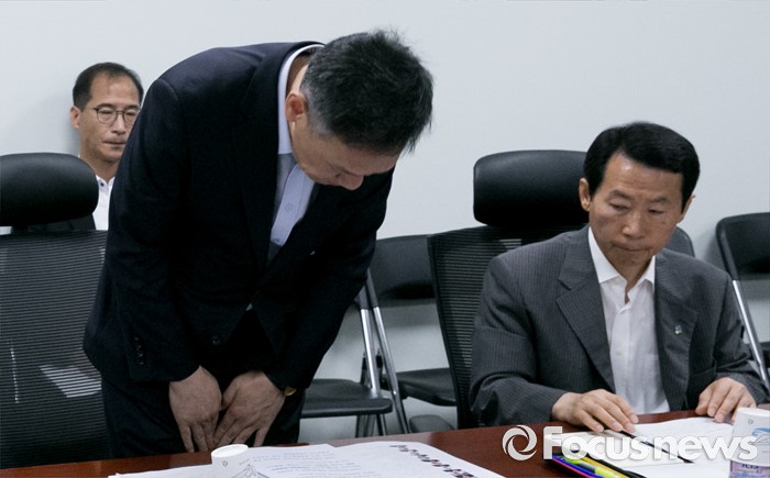 (서울=포커스뉴스) 23일 오전 서울 여의도 국회 의원회관에서 국가유공자 처우 개선 등 논의를 위해 열린 새누리당 민생혁신특별위원회-국가보훈처 간담회에 참석한 최완근(왼쪽) 국가보훈처 차장이 발언에 앞서 인사하고 있다.