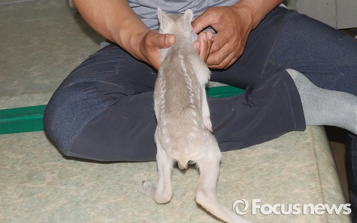 (파주 포커스뉴스) 흰고라니 새끼가 경기도 파주시 군내면 거곡리에서 지난 19일 발견돼 이를 구조한 강현철씨에게 부모처럼 접근하고 있다. <사진제공=노영대 한국자연정보원 원장>