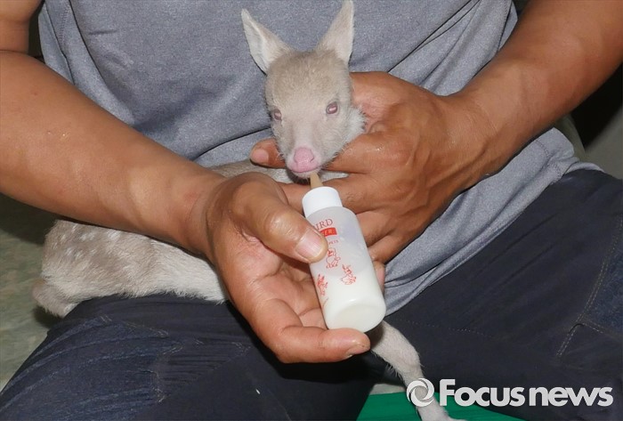 (파주 포커스뉴스) 흰고라니 새끼가 23일 오전 자신을 구조한 강현철씨가 주는 우유를 먹고 있다. <사진제공=노영대 한국자연정보원 원장>