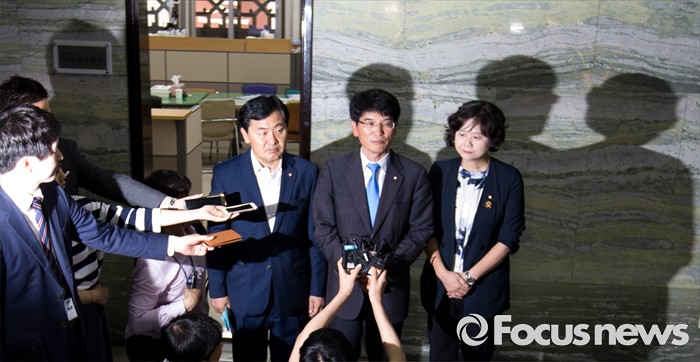 (서울=포커스뉴스) 야3당 원내수석부대표들이 23일 오전 서울 여의도 국회 의안과에서 박승춘 국가보훈처장 해임촉구결의안을 전달한 뒤 취재진 질문에 답하고 있다. 왼쪽부터 이정미 정의당 원내수석부대표, 박완주 더불어민주당 원내수석부대표, 김관영 국민의당 원내수석부대표.