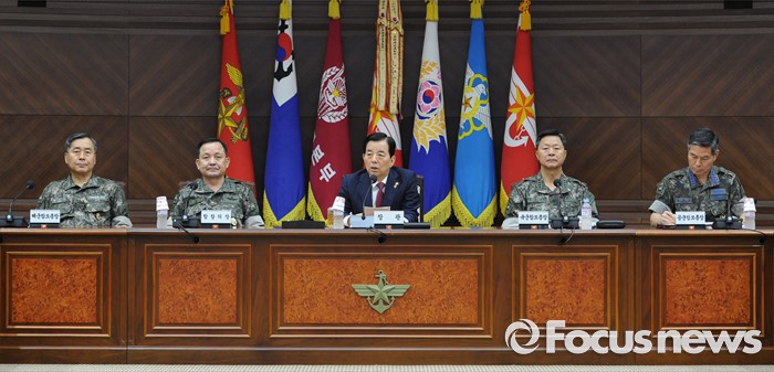 (서울=포커스뉴스) 북한이 무수단급 중거리 탄도미사일을 발사한 다음날인 23일 오전 서울 용산구 국방부 대회의실에서 열린 '2016년 전반기 전군 주요지휘관 회의'에 참석한 한민구 국방부 장관이 모두발언 하고 있다.