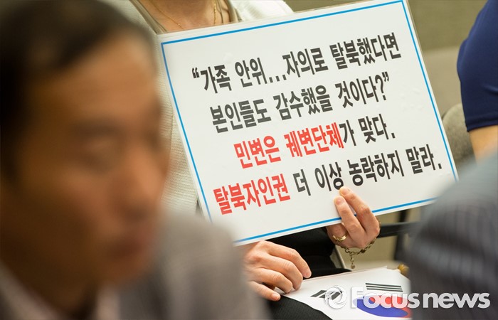 (서울=포커스뉴스) 23일 오전 서울 중구 프레스센터에서 열린 '12명 탈북민들을 사지로 내모는 민변 규탄 및 고발' 기자회견에서 탈북민단체연합 회원들이 민변을 규탄하는 손팻말을 들고 있다.