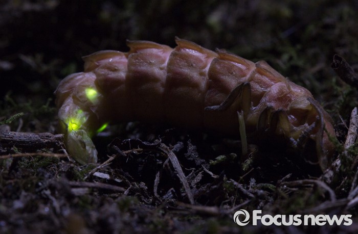 (서울=포커스뉴스)늦반디불이 암컷의 꼬리밑에서 초록빛이 발광하고 있다. <사진제공=임완호감독>