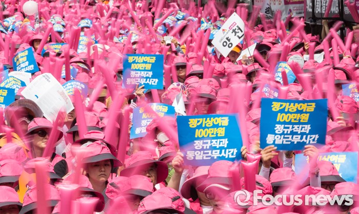 (서울=포커스뉴스) 23일 오전 서울 종로구 서울시 교육청 인근에서 전국학교비정규직 노동조합원과 공공운수노조 전국 교육공무직 본부원들이 '학교급식 인원보강 및 처우개선 철야대기 학교비정규직 처우개선 임단협 승리 총파업 결의대회' 를 하고 있다.