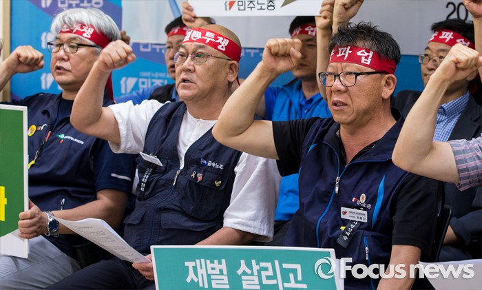 (서울=포커스뉴스) 23일 오전 서울 중구 민주노총 대회의실에서 열린 '민주노총 총파업ㆍ총력투쟁 선포' 기자회견에 참석한 최종진 수석부위원장 및 산별 대표자들이 총파업을 결의하는 구호를 외치고 있다.