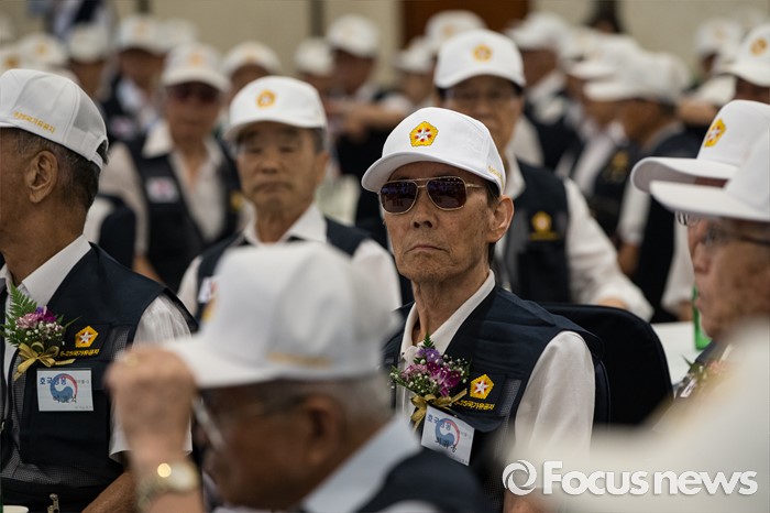 (서울=포커스뉴스) 23일 오전 서울 용산구 전쟁기념관 뮤지엄 웨딩홀에서 참전유공자들이 '6.25전쟁 참전유공자 위로연 및 호국영웅기장 전수식'에 참석하고 있다.