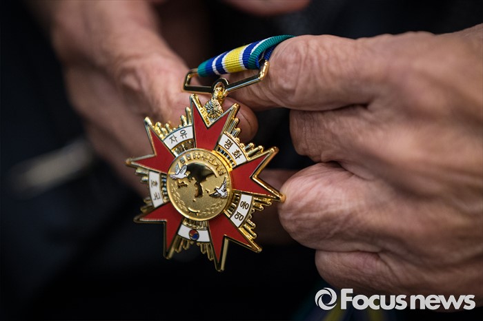 (서울=포커스뉴스) 23일 오전 서울 용산구 전쟁기념관 뮤지엄 웨딩홀에서 참전유공자가 '6.25전쟁 참전유공자 위로연 및 호국영웅기장 전수식'에 참석해 호국영웅기장을 만지고 있다.