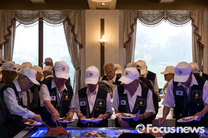 (서울=포커스뉴스) 23일 오전 서울 용산구 전쟁기념관 뮤지엄 웨딩홀에서 참전유공자들이 '6.25전쟁 참전유공자 위로연'에 참석해 식사를 준비하고 있다.
