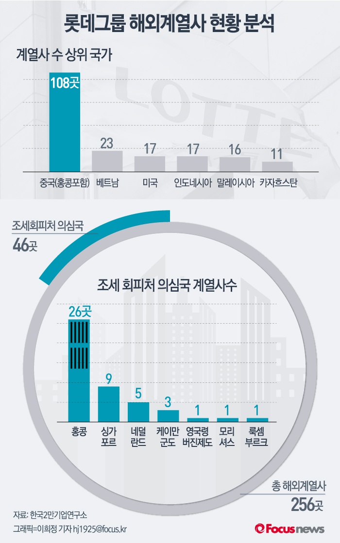 (서울=포커스뉴스) 23일 한국2만기업연구소 '롯데그룹 해외 계열사 현황 분석'에 따르면 롯데그룹의 해외 계열사 수가 올해 256곳 집계됐다.이 중 절반에 가까운 108곳은 중국(홍콩 포함)에 소재한 것으로 파악됐으며 조세 피난처로 의심되는 지역에 46개의 법인을 두고 있는 것으로 파악됐다.