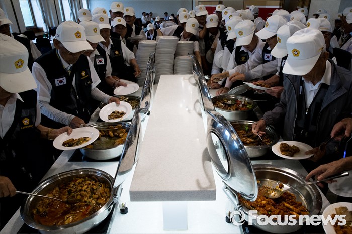 (서울=포커스뉴스) 23일 오전 서울 용산구 전쟁기념관 뮤지엄 웨딩홀에서 참전유공자들이 '6.25전쟁 참전유공자 위로연'에 참석해 식사를 준비하고 있다.