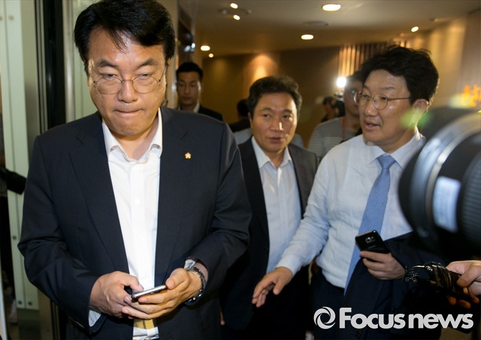 (서울=포커스뉴스) 정진석(왼쪽부터) 새누리당 원내대표, 이학재 비대위원, 사무총장직을 사퇴한 권성동 의원이 23일 오후 서울 여의도 한 음식점에서 진행된 비상대책위원들과의 오찬 모임에 참석하고 있다.