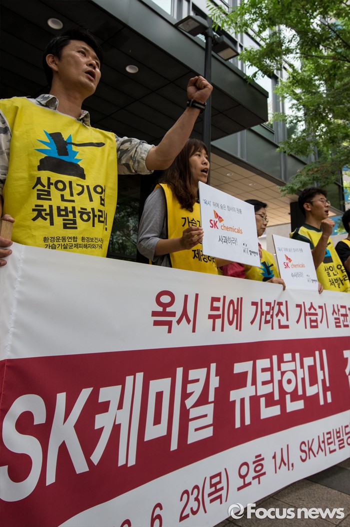 (서울=포커스뉴스) 23일 오후 서울 종로구 SK 본사 앞에서 열린 'SK케미칼 규탄 및 책임자 수사 촉구' 기자회견에서 가습기살균제참사전국네트워크 회원들이 SK케미칼을 규탄하는 구호를 외치고 있다.