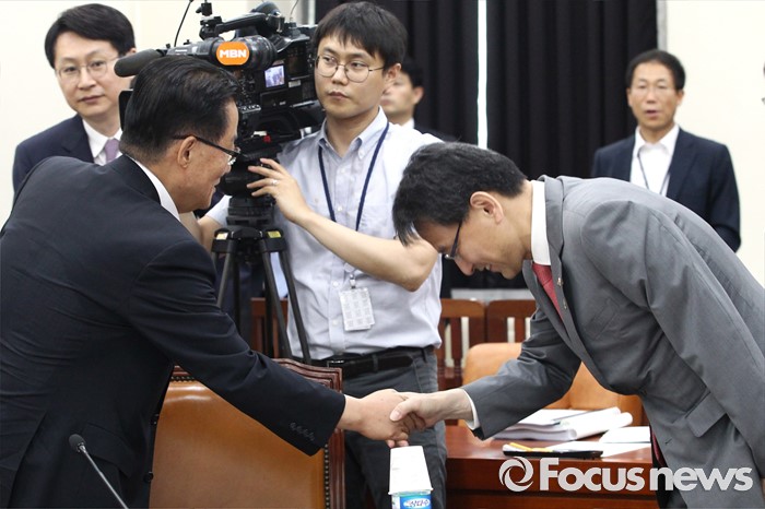 (서울=포커스뉴스) 23일 오후 서울 여의도 국회에서 열린 정보위원회 전체회의에 참석한 박지원(왼쪽) 국민의당 원내대표와 이창재 법무부 차관이 인사하고 있다.