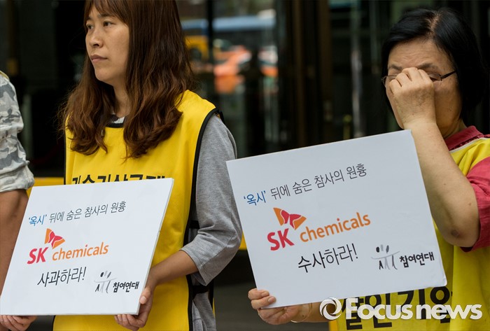 (서울=포커스뉴스) 23일 오후 서울 종로구 SK 본사 앞에서 열린 'SK케미칼 규탄 및 책임자 수사 촉구' 기자회견에서 가습기살균제참사전국네트워크 회원들이 SK케미칼을 규탄하는 손팻말을 들고 있다.