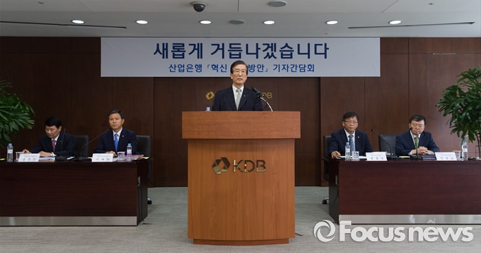 (서울=포커스뉴스) 23일 오후 서울 영등포구 KDB산업은행 본점에서 열린 산업은행 혁신 추진방안 기자간담회에 참석한 이동걸(가운데) KDB산업은행 회장이 혁신 추진방안을 발표하고 있다.