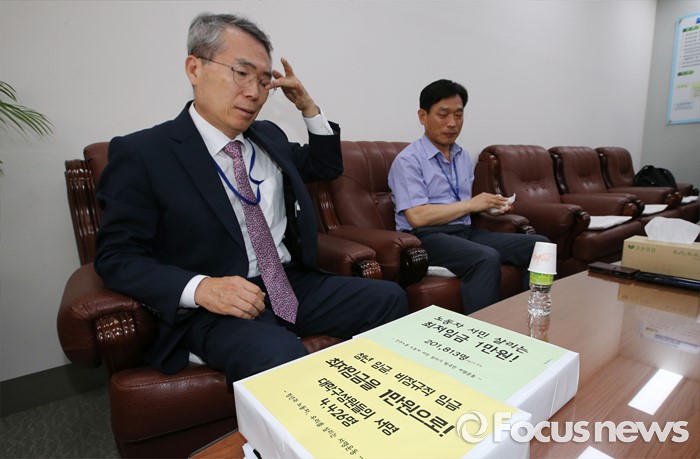 (세종=포커스뉴스) 박준성 최저임금위원회 위원장이 23일 오후 세종시 정부세종청사 고용노동부 최저임금위원장실에서 최종진 민주노총 위원장 직무대행과 관계자들로부터 최저임금 1만원 서명지를 받고 있다.