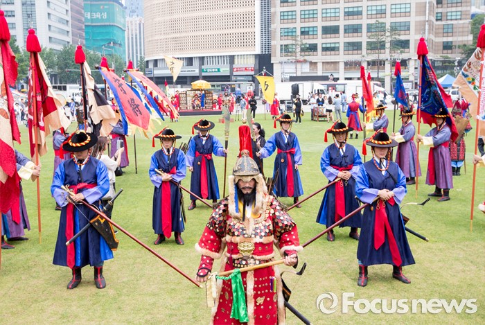 (서울=포커스뉴스) 23일 오후 서울광장에서 열린 '왕궁수문장 20주년 기념행사'에 참석한 관계자들이 대열의식을 재현하고 있다.