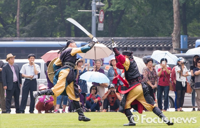 서울=포커스뉴스) 23일 오후 서울광장에서 열린 '왕궁수문장 20주년 기념행사'에 참석한 국방부 전통의장대원들이 무예 시범을 보이고 있다.