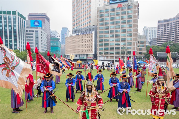 (서울=포커스뉴스) 23일 오후 서울광장에서 열린 '왕궁수문장 20주년 기념행사'에 참석한 관계자들이 대열의식을 재현하고 있다.
