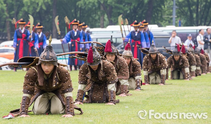(서울=포커스뉴스) 23일 오후 서울광장에서 열린 '왕궁수문장 20주년 기념행사'에 참석한 관계자들이 대열의식을 재현하고 있다.