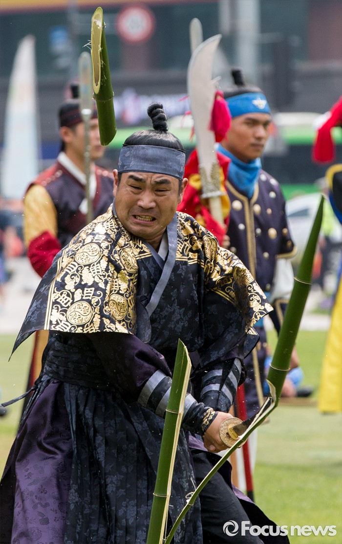 (서울=포커스뉴스) 23일 오후 서울광장에서 열린 '왕궁수문장 20주년 기념행사'에 참석한 관계자가 진검 대나무 베기 시범을 보이고 있다.