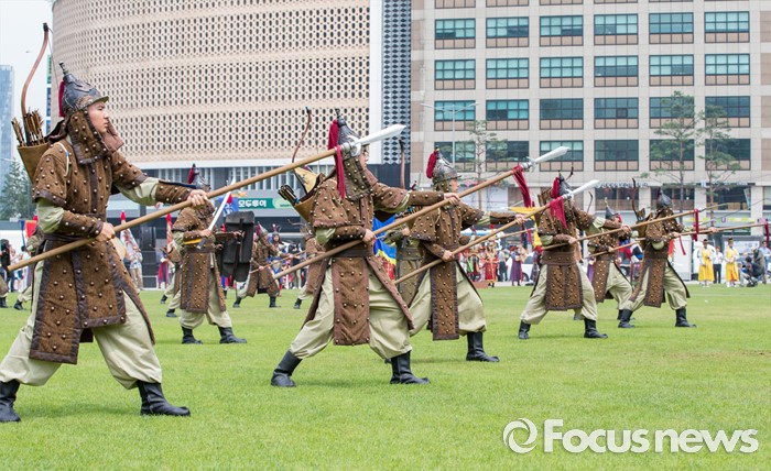 (서울=포커스뉴스) 23일 오후 서울광장에서 열린 '왕궁수문장 20주년 기념행사'에 참석한 관계자들이 대열의식을 재현하고 있다.