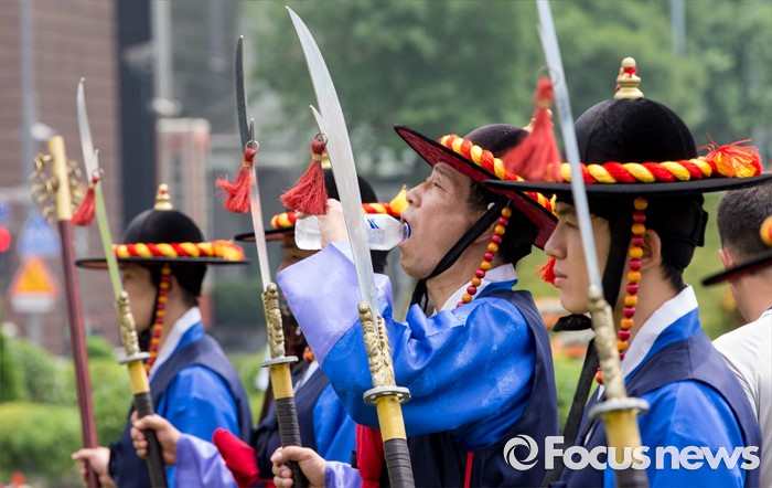 (서울=포커스뉴스) 23일 오후 서울광장에서 열린 '왕궁수문장 20주년 기념행사'에 참석한 관계자가 물을 마시고 있다.