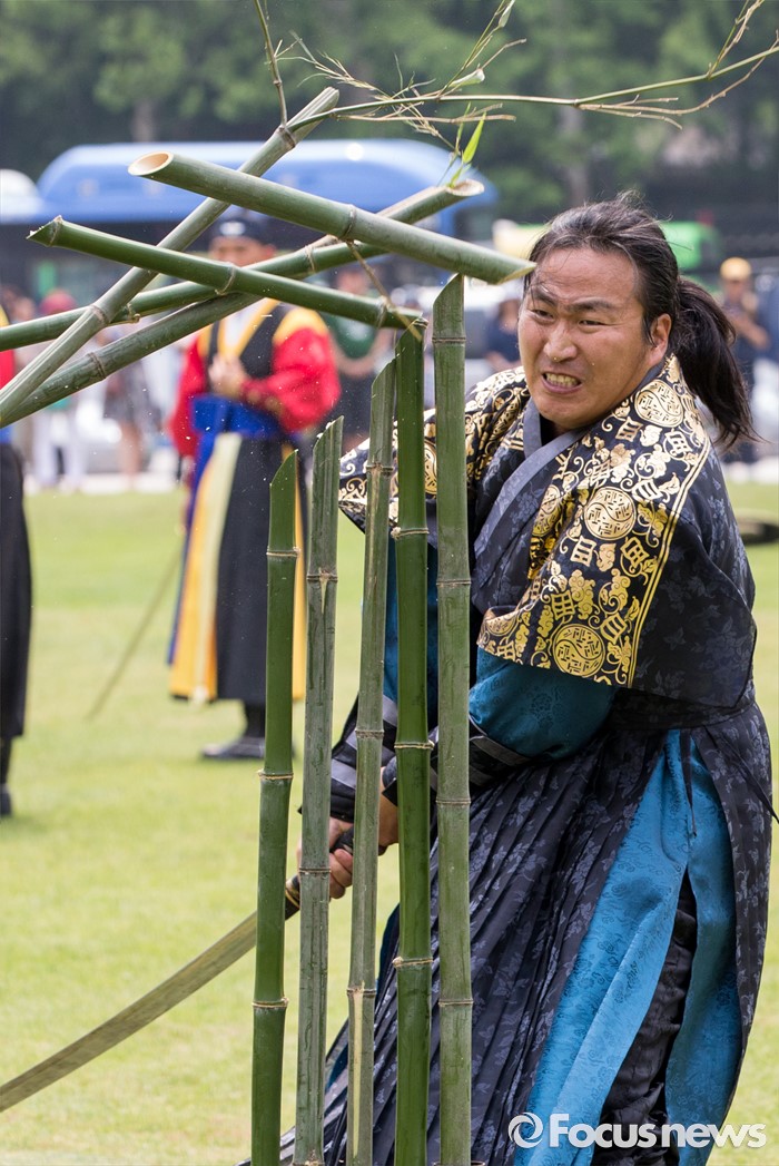 (서울=포커스뉴스) 23일 오후 서울광장에서 열린 '왕궁수문장 20주년 기념행사'에 참석한 관계자가 진검 대나무 베기 시범을 보이고 있다.