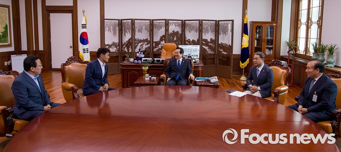 (서울=포커스뉴스) 정세균(가운데) 국회의장이 23일 오후 서울 여의도 국회에서 장휘국 전국시도교육감협의회 회장을 비롯한 교육감들과 면담 하고 있다. 왼쪽부터 민병희 강원도교육감, 이청연 인천시교육감, 정세균 국회의장, 이재정 경기도교육감, 장휘국 광주시교육감.