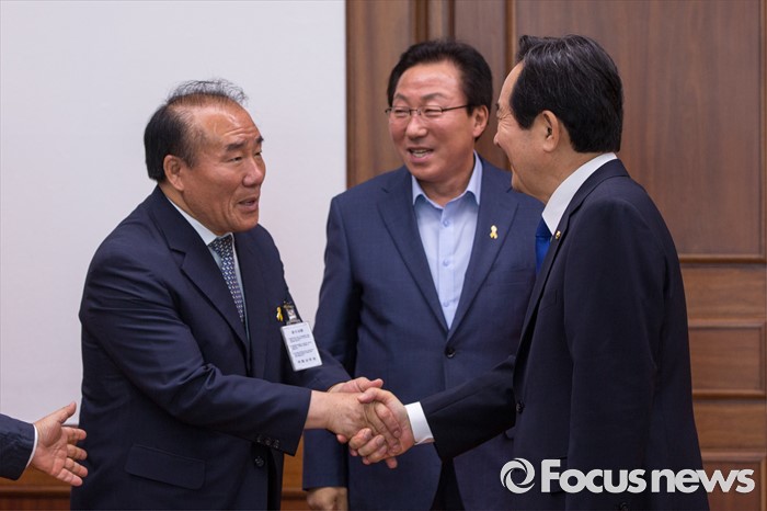 (서울=포커스뉴스) 정세균(오른쪽) 국회의장이 23일 오후 서울 여의도 국회에서 장휘국(왼쪽) 광주시교육감과 면담에 앞서 악수 하고 있다.