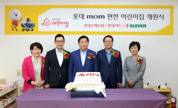 앞서 검찰은 지난 16일 채정병 롯데카드 대표를 소환해 조사한 바 있다. 채 대표는 롯데쇼핑 사장으로 근무하던 지난 2011년부터 2014년까지 그룹 내 정책본부지원실 실장도 겸임한 것으로 알려졌다.(사진 왼쪽부터) 롯데 mom편한어린이집 최민화 원장, 롯데손해보험 김현수 대표이사, 롯데카드 채정병 대표이사, 코리아세븐 정승인 대표이사, 모아맘보육경영원 최윤이 상무가 롯데 mom편한어린이집 30일 열린 어린이집 개원식 기념촬영을 하고 있다.<사진제공=롯데손해보험>