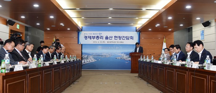 (울산=포커스뉴스) 유일호 부총리 겸 기획재정부 장관이 23일 구조조정 관련 현장방문으로 현대중공업 울산조선소에서 선박건조 현장을 둘러본 후 울산시청에서 유관기관 및 기업들과의 간담회를 갖고 있다. <사진제공=기획재정부>