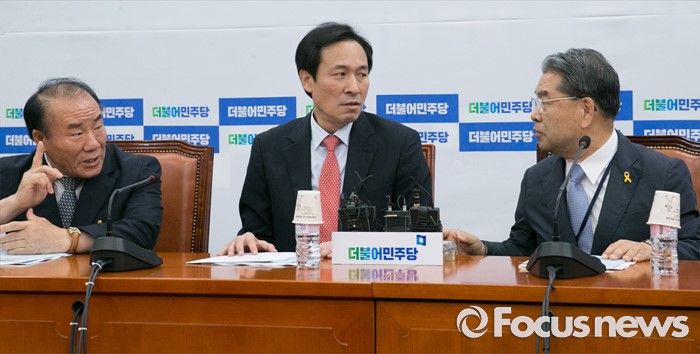 (서울=포커스뉴스) 23일 오후 서울 여의도 국회에서 열린 누리과정 및 지방교육재정 해결 위한 전국시도교육감협의회와 간담회에 참석한 우상호(가운데) 더불어민주당 원내대표와 장휘국(왼쪽) 전국시도교육감협의회장, 이재정 경기도교육감이 대화하고 있다.