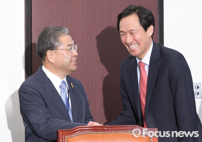 (서울=포커스뉴스) 23일 오후 서울 여의도 국회에서 열린 누리과정 및 지방교육재정 해결 위한 전국시도교육감협의회와 간담회에 참석한 우상호(오른쪽) 더불어민주당 원내대표와 이재정 경기도교육감이 인사하고 있다.