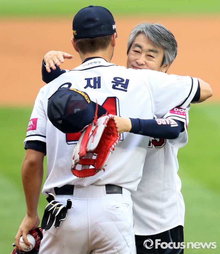 (서울=포커스뉴스) 23일 서울 잠실구장에서 열린 2016 프로야구 kt-두산 경기에서 두산 오재원의 1천 경기 기념식에 맞춰 오재원이 시구한 부친 오병현씨와 포옹하고 있다.