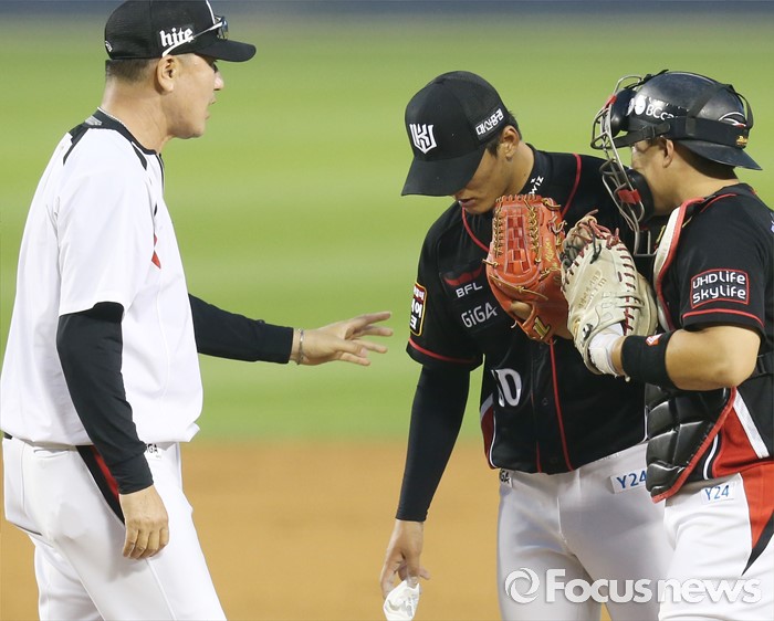 (서울=포커스뉴스) 23일 서울 잠실구장에서 열린 2016 프로야구 kt-두산 경기 4회말 무사 2루에서 kt 정명원 코치가 마운드에서 투수 주권과 대화하고 있다.