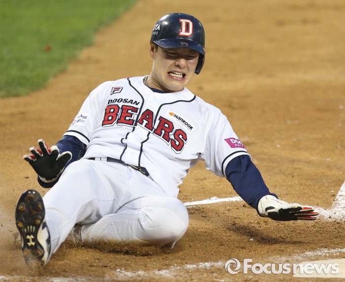 (서울=포커스뉴스) 23일 서울 잠실구장에서 열린 2016 프로야구 kt-두산 경기 4회말 무사 1루에서 두산 1루주자 민병헌이 김재환의 우중간 2루타떄 홈에서 슬라이딩하며 세이프되고 있다.