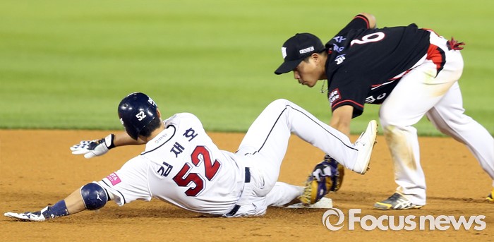 (서울=포커스뉴스) 23일 서울 잠실구장에서 열린 2016 프로야구 kt-두산 경기 7회말 두산 김재호가 좌익수 왼쪽으로 빠지는 안타를 치고 2루까지 달리다 kt 2루수 박경수에게 태그아웃되고 있다.
